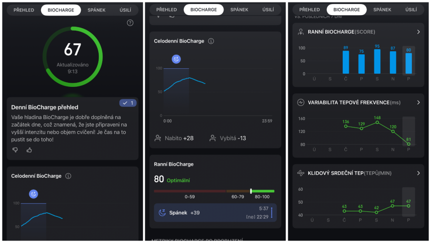 Hlavnou výhodou funkcie Biocharge je jednoduchosť a praktickosť. Namiesto sledovania metrík samostatne dostanete jeden zrozumiteľný ukazovateľ, podľa ktorého si môžete lepšie plánovať tréning, pracovné nasadenie alebo regeneráciu. Pomáha odhaliť, ako je telo pripravené na výkon a či v daný deň zvoliť niečo náročnejšie, alebo pokojnejšie.