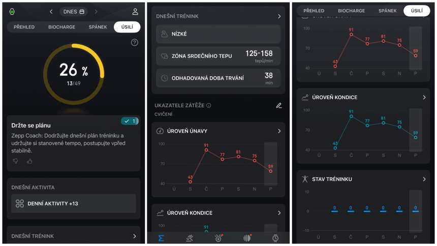 V aplikácii nájdete záložku s názvom Úsilie, ktorá vám poskytne údaje o stave vášho tréningu, alebo ak chcete, o pomere chronickej a akútnej tréningovej záťaže. V tejto záložke uvidíte okrem iného ukazovateľ úsilia pre daný deň a tiež údaje o úrovni únavy a kondície.