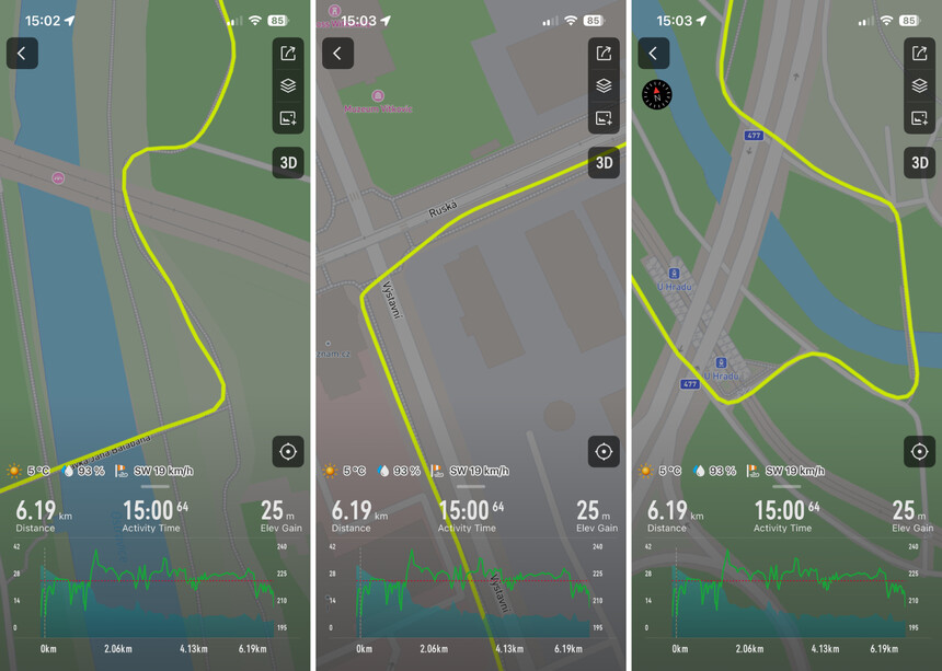 Mapové podklady celého sveta (a k tomu zhruba 27 GB priestoru). Omnoho rýchlejšie, omnoho podrobnejšie (zoom až na 15 metrov). Názvy ulíc, POI, vrstevnice, turn-by-turn navigácia a navyše extrémne rýchly prechod na mapu pomocou akčného tlačidla. Coros to má naozaj vychytané a je vidieť, že majú všeobecne monitoring spustených aktivít dotiahnutý do detailu. Prosto sa ukazuje, že to testujú skutoční športovci, a nie len náhodní ambasádori.