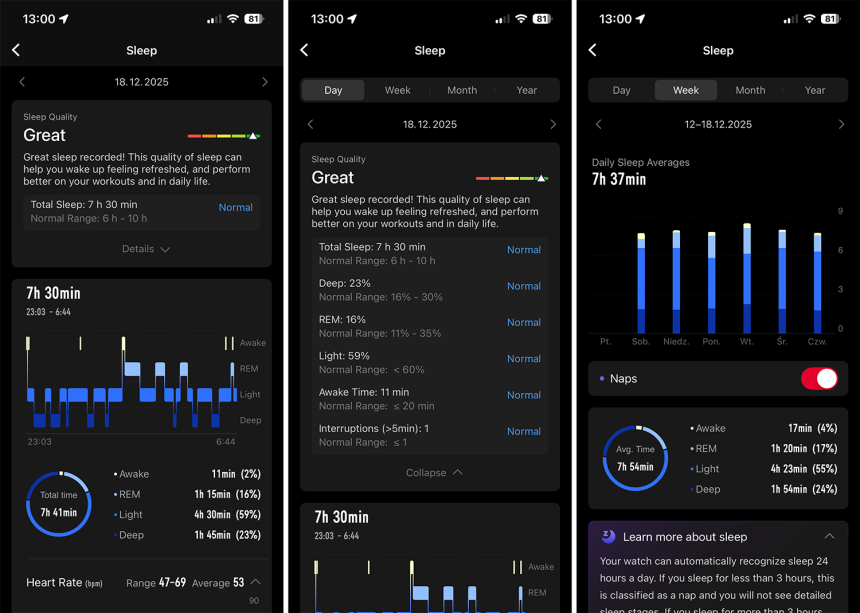 Čo oceňujem, je ukazovateľ rozptylu srdcovej frekvencie. V rámci spánkového monitoringu máte k dispozícii tri kľúčové údaje – najnižší, najvyšší a priemerný tep.