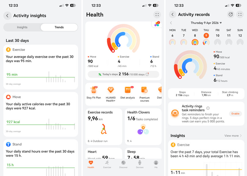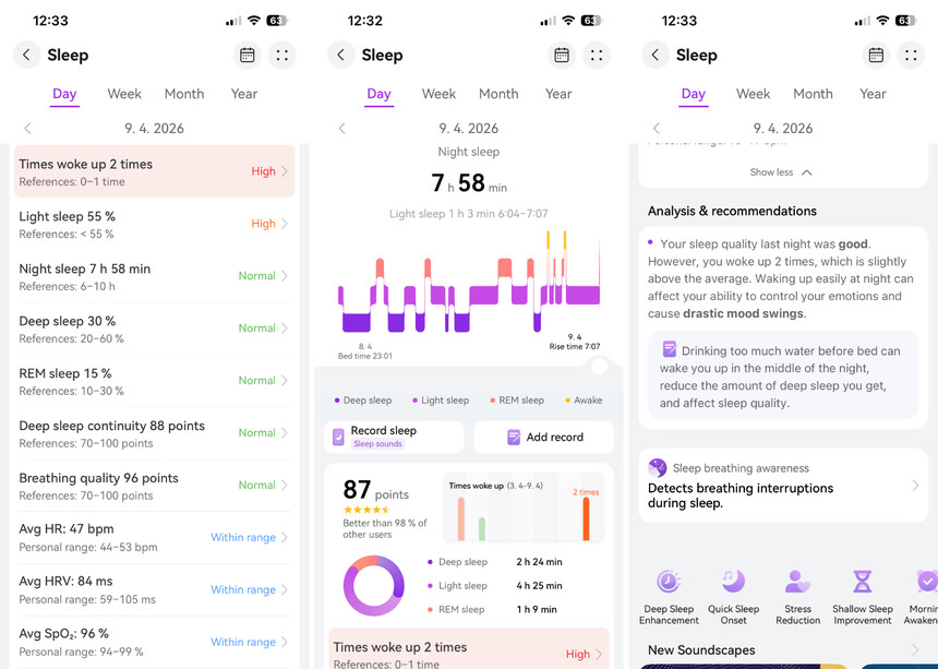 Huawei to všetko umocňuje na druhú. Má veľmi dobre podchytené denné ciele, naozaj podrobný monitoring spánku s rôznymi radami, vyhodnotením kontinuity, celkovým skóre a tak ďalej.