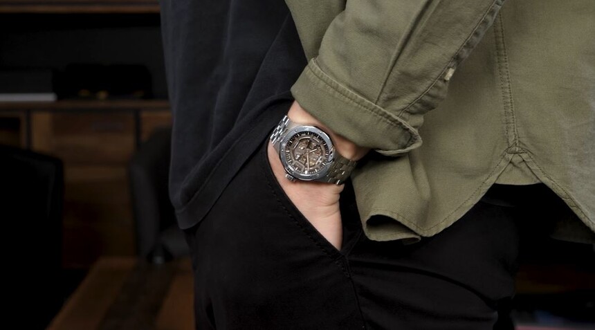 Mizne prípadný problém s integrovaným náramkom, ktorý nielen opticky, ale najmä reálne predlžuje dĺžku hodiniek. Dĺžka od nožky k nožke je nanovo 47,1 mm a priemer cez korunku 44,2 mm. A hrúbka? Len 11,7 mm. Aj tak napriek tomu, že sú stále pomerne robustné, sedia aj na menších zápästiach.