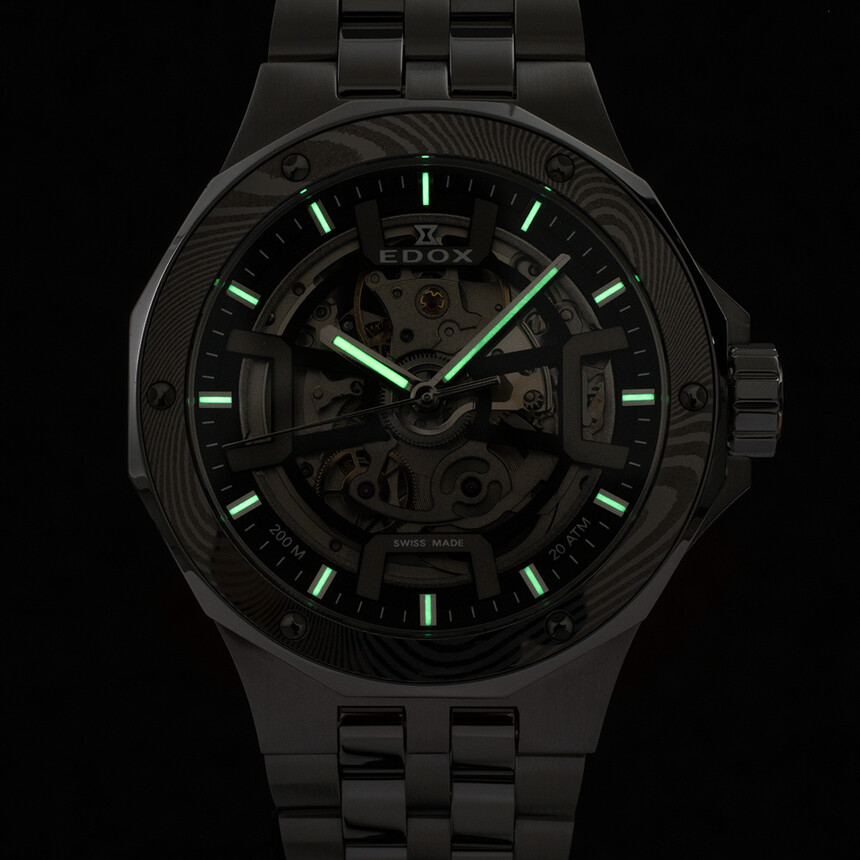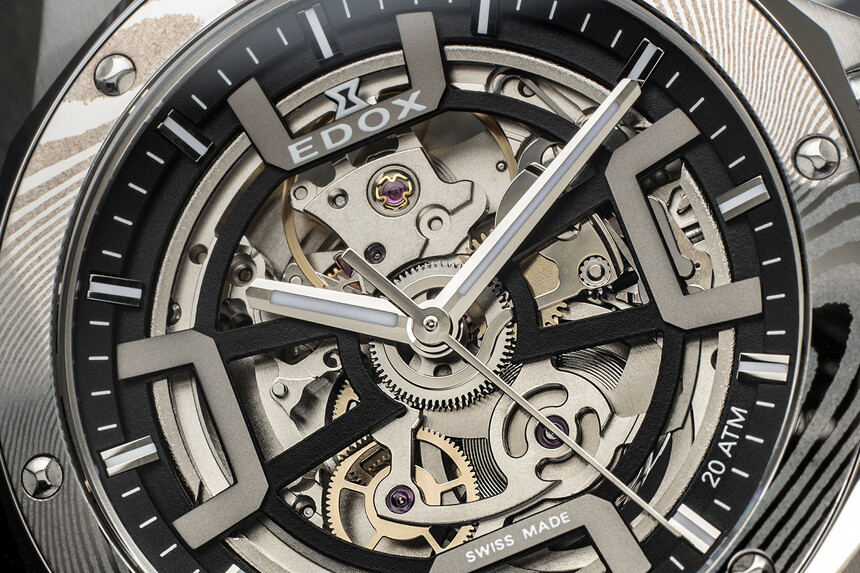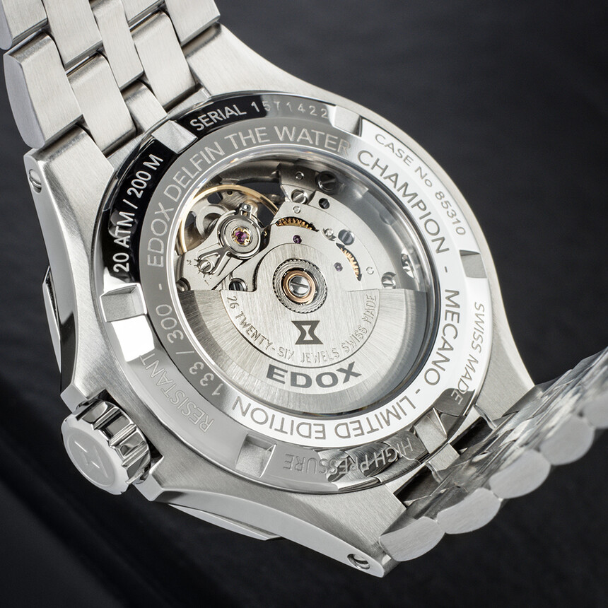 Damašková oceľ krásne dopĺňa vrstvený číselník a k modelu sa tak hodí. Edox navyše poukazuje na vzor pripomínajúci vlny, a preto si s ňou pohral práve pri Delfinoch. Potápky, voda, vlny... chápete.