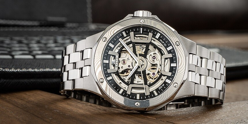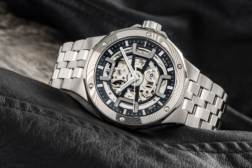 Už z produktových fotiek (alebo názvu) je jasné, že hodinkám sa dostalo damaškovej ocele. Nie je z nej síce celé puzdro, ale len vložený krúžok lunety, no efekt to má dostatočný.