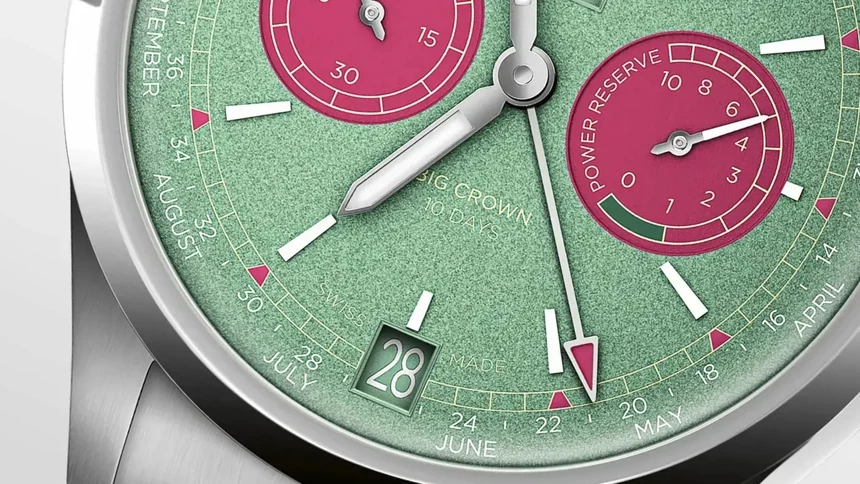 Na prvý pohľad zaujmú samozrejme farebným prevedením číselníka. To rozhodne nie je bežné. A tiež nie je náhodné. Bolo vybrané ako pripomienka tradičnej farby hodinárskeho zeleného náradia v kombinácii s výraznou, teplejšou ružovou s nádychom fuchsiovo‐malinového tónu. Oris okamžite vzbudí pozornosť a vyvoláva silne pozitívne emócie.