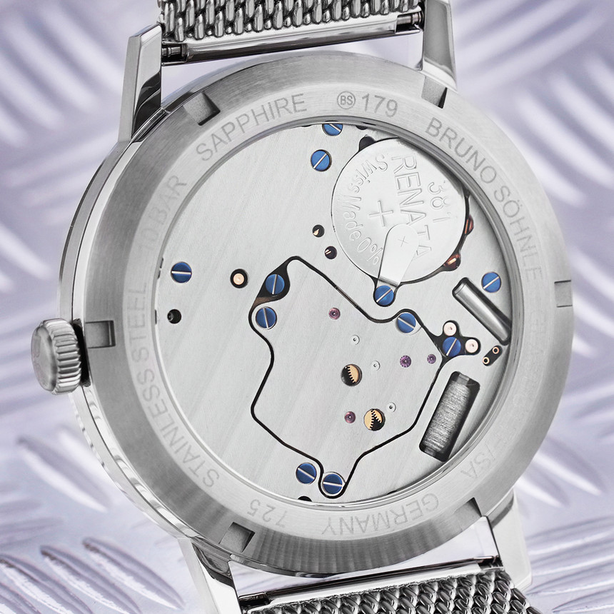 Quartzový strojček ako estetická záležitosť. Priehľady cez dienko na quartzové strojčeky nie sú úplne bežnou záležitosťou. Bruno ich ale dáva na obdiv. Upravuje, zdobí, najčastejšie ženevskými pruhmi, dokonca im dopraje často aj pozlátenú úpravu. V kombinácii s kalenými skrutkami potom zdanlivo obyčajný batériový strojček pôsobí ako sofistikované moderné umenie. Priehľady nájdeme u väčšiny kolekcie quartzových hodiniek Bruno Söhnle. Ešte pripomeňme, že quartzové strojčeky stoja na základoch švajčiarskych Ronda kalibrov.