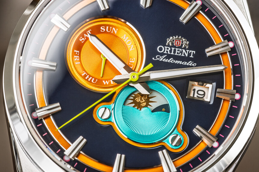 Kombinuje krásne kontrastnú tmavomodrú s oranžovou, svetlozelenou (sekundová ručička) a dokonca aj ružovou (indexy na obvodovom krúžku, ktorých si síce človek nemá šancu na diaľku všimnúť, ale zblízka vyzerajú úplne famózne).