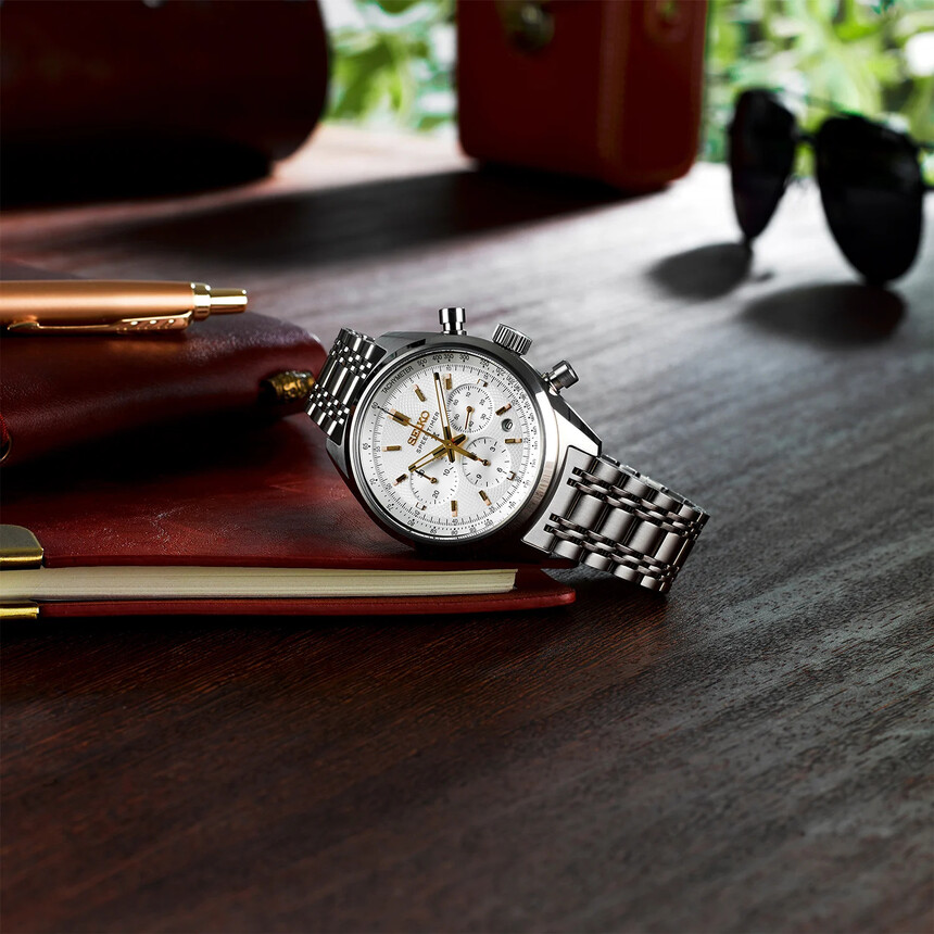 Elegantné poňatie chronografu umocňuje krémový číselník, opäť so štruktúrou odkazujúcou na rytinu hodiniek z počiatkov Seika. Do zlatého tónu sú zahalené ručičky, indexy aj logo.