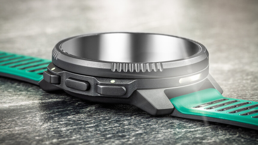 Sklo je zapustené na úroveň lunety, ktorá má po časti svojho obvodu priehlbiny. Dodáva to vonkajší dojem, ktorý sa hodí k hodinkám Vertical. Na pravej strane puzdra máme 3 tlačidlá. Aj to je jemný rozdiel oproti modelu Race 2, ktorý má korunku uprostred.