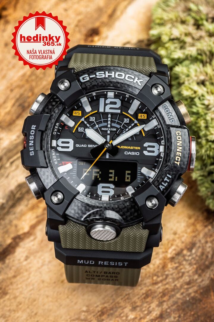 Zvýšenú odolnosť voči blatu a prachu zabezpečuje aj dvojité dienko. Klasický kovový ciferník, na ktorý sme zvyknutí z bežných hodiniek G-Shock, je stále ukrytý pod živicovým dienkom, ktorý je vystužený sklenenými vláknami. Samozrejme, nechýba ani odolnosť voči nárazom, ktorá je podstatou radu G-Shock. V tomto modeli sa však posunula ešte ďalej vďaka použitiu karbónu, ktorý je ľahší a pevnejší ako oceľ. Jeho použitie je teda viditeľné na lunete, ktorá sa skladá z troch vrstiev priehľadnej živice pretkanej uhlíkovými vláknami. O svoje hodinky sa tak nemusíte báť ani v tých najextrémnejších podmienkach.