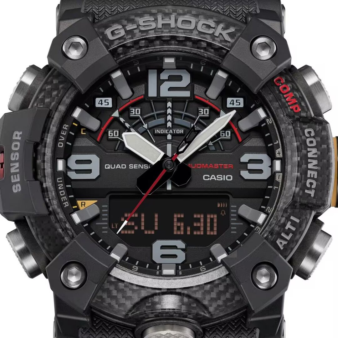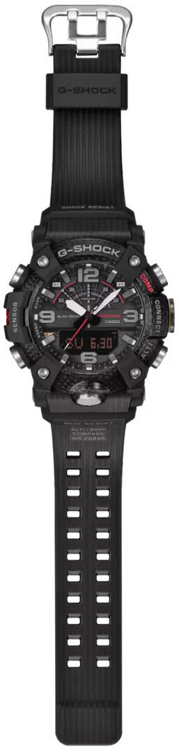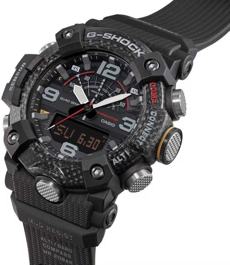 Zvýšenú odolnosť voči blatu a prachu zabezpečuje aj dvojité dienko. Klasický kovový ciferník, na ktorý sme zvyknutí z bežných hodiniek G-Shock, je stále ukrytý pod živicovým dienkom, ktorý je vystužený sklenenými vláknami. Samozrejme, nechýba ani odolnosť voči nárazom, ktorá je podstatou radu G-Shock. V tomto modeli sa však posunula ešte ďalej vďaka použitiu karbónu, ktorý je ľahší a pevnejší ako oceľ. Jeho použitie je teda viditeľné na lunete, ktorá sa skladá z troch vrstiev priehľadnej živice pretkanej uhlíkovými vláknami. O svoje hodinky sa tak nemusíte báť ani v tých najextrémnejších podmienkach.