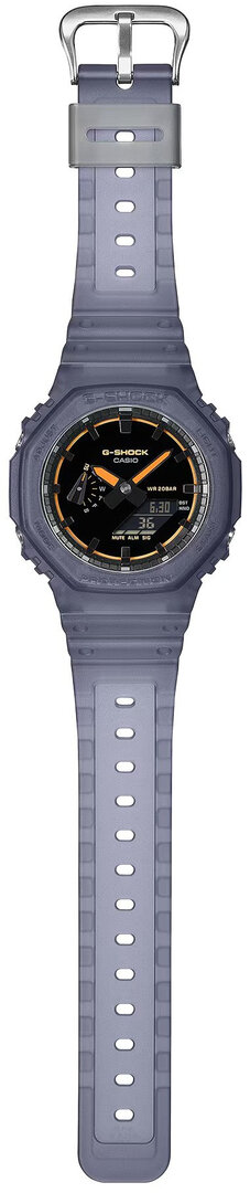 Vďaka použitiu karbónu, teda konštrukcia Carbon Core Guard, sú hodinky ľahučké a ich „vnútornosti" sa podarilo zmestiť do puzdra vysokého len 11,8 mm, čo robí model GA-2100 snáď najtenšími G-Shockmi vôbec. Priemer puzdra, by sa dal (vo svete G-Shockov) nazvať skôr ako „podpriemer". Ale práve vďaka tomu sadnú hodinky dobre na ruku aj „menej obdareným" jedincom a ľahko sa schovajú pod rukáv.