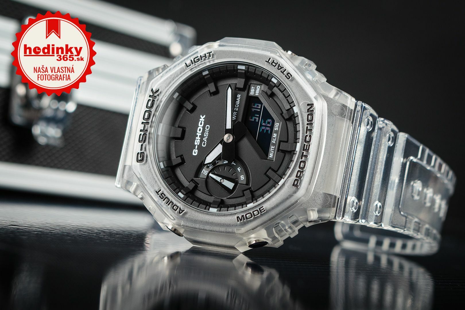 Casio. G-Shock. Nič viac, nič menej. Kto pozná tieto hodinky vie do čoho ide. Kto nie tak tomu ich odporúčam všetkými desiatimi. Tieto hodinky majú tvar veľmi podobný AP Royal Oak-om, preto dostali prezývku CasiOak. Sú perfektne viditeľné, či už na priamom slnku alebo pri tme. V uplnej tme máte k dispo osvetlenie ciferníka. Tento ciferník je lepšie viditelný ako na klasických stealthových GA-2100 a v kombinácii s priesvitným skeleton remienkom a bezelom to je čistá báseň. Pri namočení je normálne, že voda vlezie popod živicovú ochranu a tým padom bude pekne vidno karbónovú štruktúru. O technických vlastnostiach nepíšem nakoľko sú rovnaké ako pri ostatných modeloch. Nemajú sekundovku, len digitálnu ale vôbec to neprekáža.Tým, že sú z priehladnej živice aj bezel aj remienok tak feeling je trošku iný ako pri klasickej živici.Dokonca z (domácej) skusenosti sú aj antialergenne - pre tých ktorý majú problém s klasickou živicou(resin). Remienok je trošku tuhší ale neprekáža. Tým, že sú extra ľahké a tenké, človek a zabudne, že ich má na ruke. Hodinky365 ich mali ako prvý na slovensku a to je paráda. Jaaj a posledná vec kupujte lebo model sa už nevyrába, takže šup-šup po ne. Neoľutujete :)