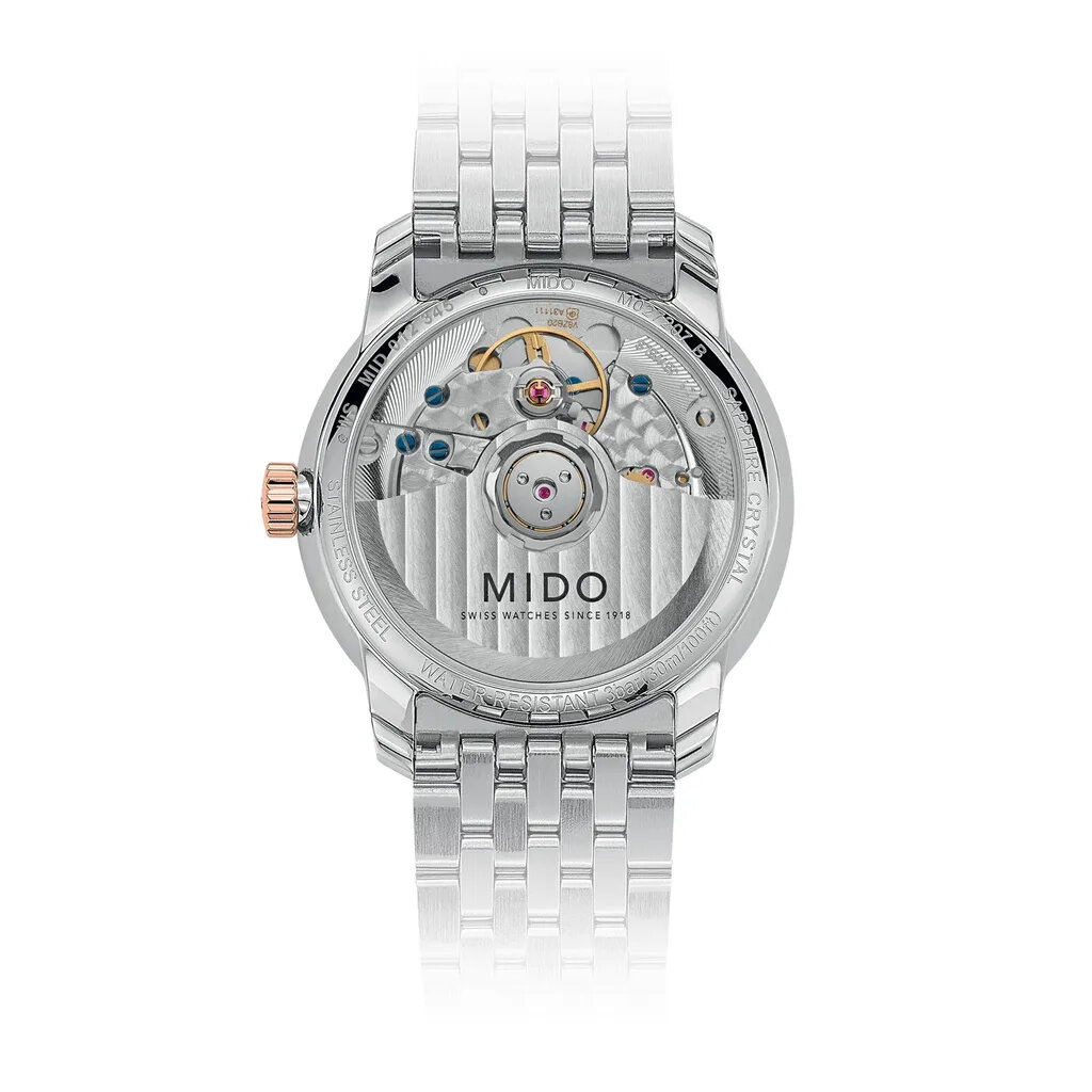 Cez priehľadný ciferník je vidieť nádherne zdobený mechanický strojček s automatickým naťahovaním, ktorý sa sám napína pohybom zápästia. Ide o kaliber Mido 72 so 72-hodinovou rezervou chodu, 21 drahokamami a závitom Nivachron, ktorý má antimagnetické vlastnosti. A čo znamená antimagnetický v praxi? Prečítajte si náš článok.