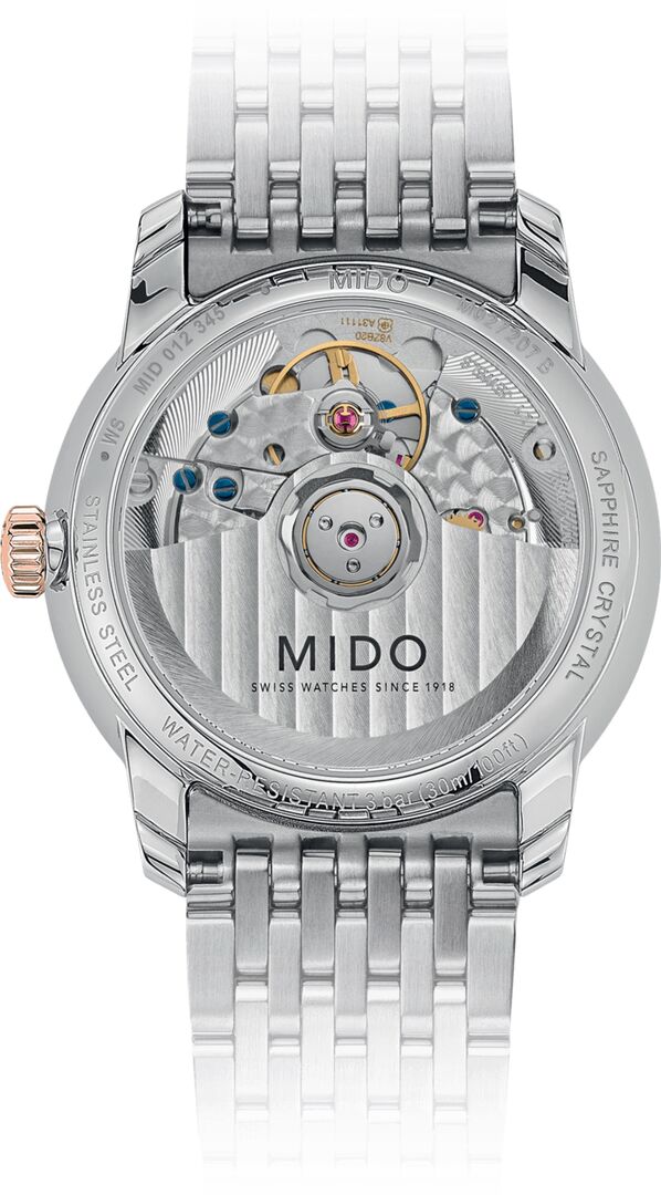 Cez priehľadný ciferník je vidieť nádherne zdobený mechanický strojček s automatickým naťahovaním, ktorý sa sám napína pohybom zápästia. Ide o kaliber Mido 72 so 72-hodinovou rezervou chodu, 21 drahokamami a závitom Nivachron, ktorý má antimagnetické vlastnosti. A čo znamená antimagnetický v praxi? Prečítajte si náš článok.