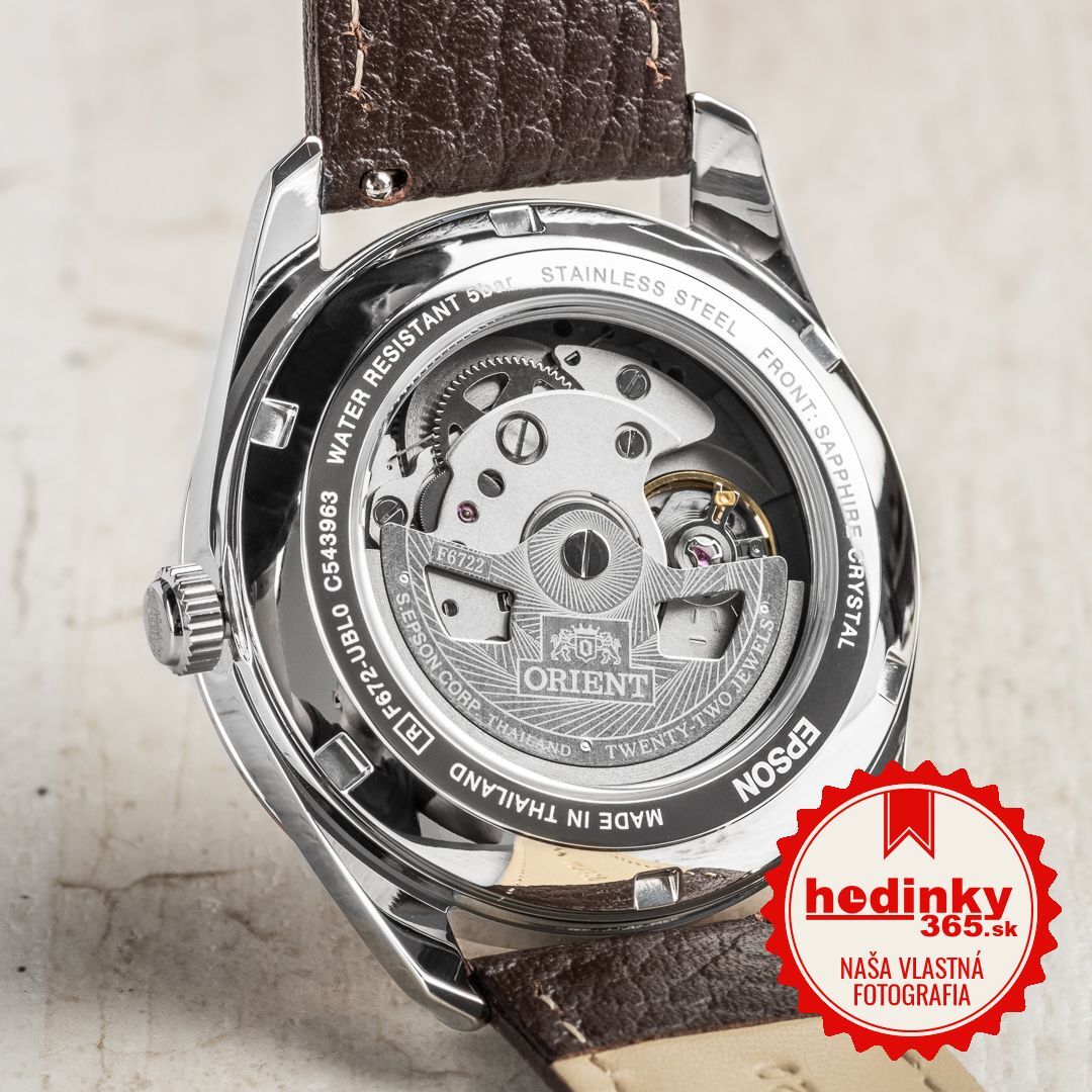 Mechanický s automatickým náťahom. Orient F6722, Rezerva chodu 40h, 21.600 BPH (3Hz), 22 kameňov, Hacking, Možnosť ručného náťahu