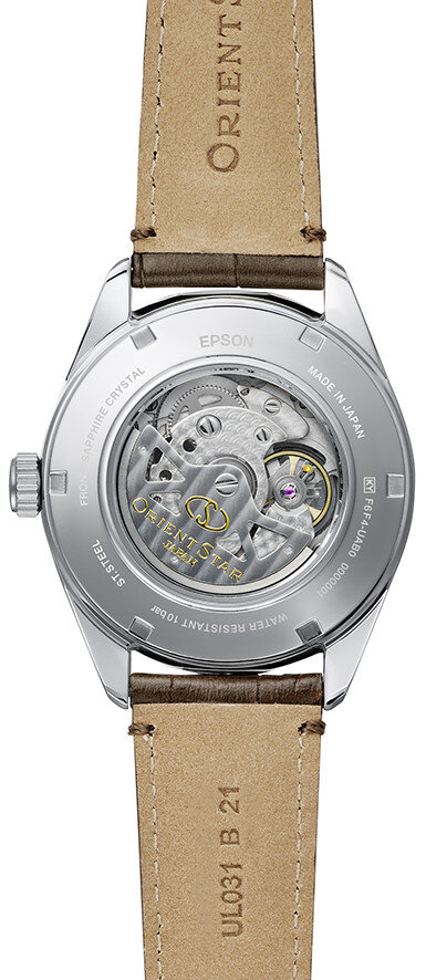 Mechanický s automatickým náťahom. Orient F6F44, Rezerva chodu 50h, 21.600 BPH (3Hz), 24 kameňov, Možnosť ručného náťahu