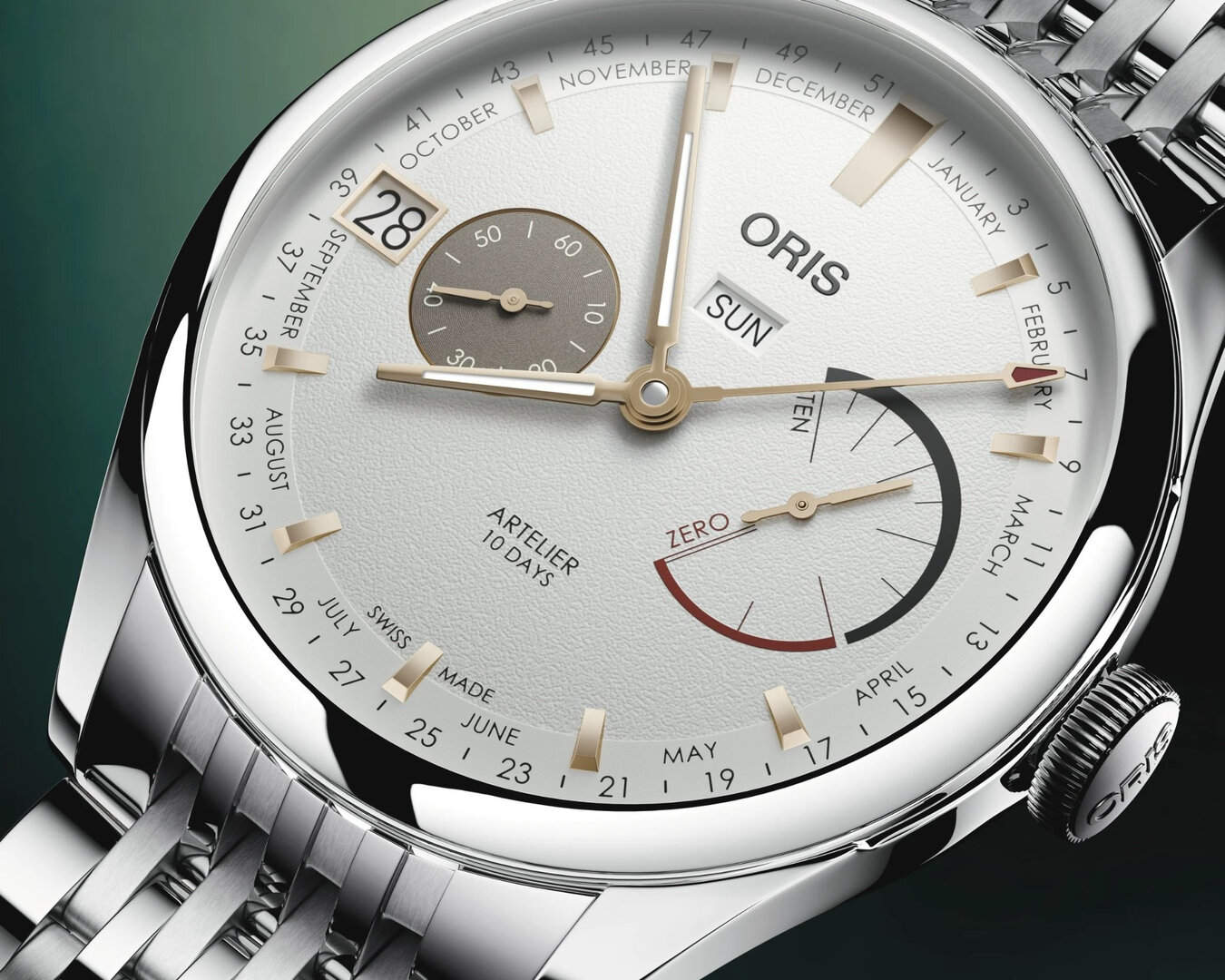 Mechanický s ručným náťahom. Oris 113, Rezerva chodu 240h, 21.600 BPH (3Hz)