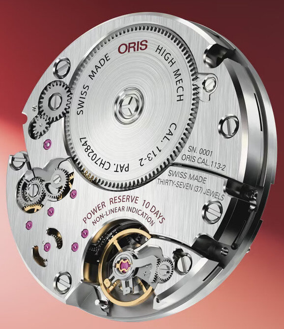 Mechanický s ručným náťahom. Oris 113, Rezerva chodu 240h, 21.600 BPH (3Hz)