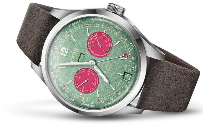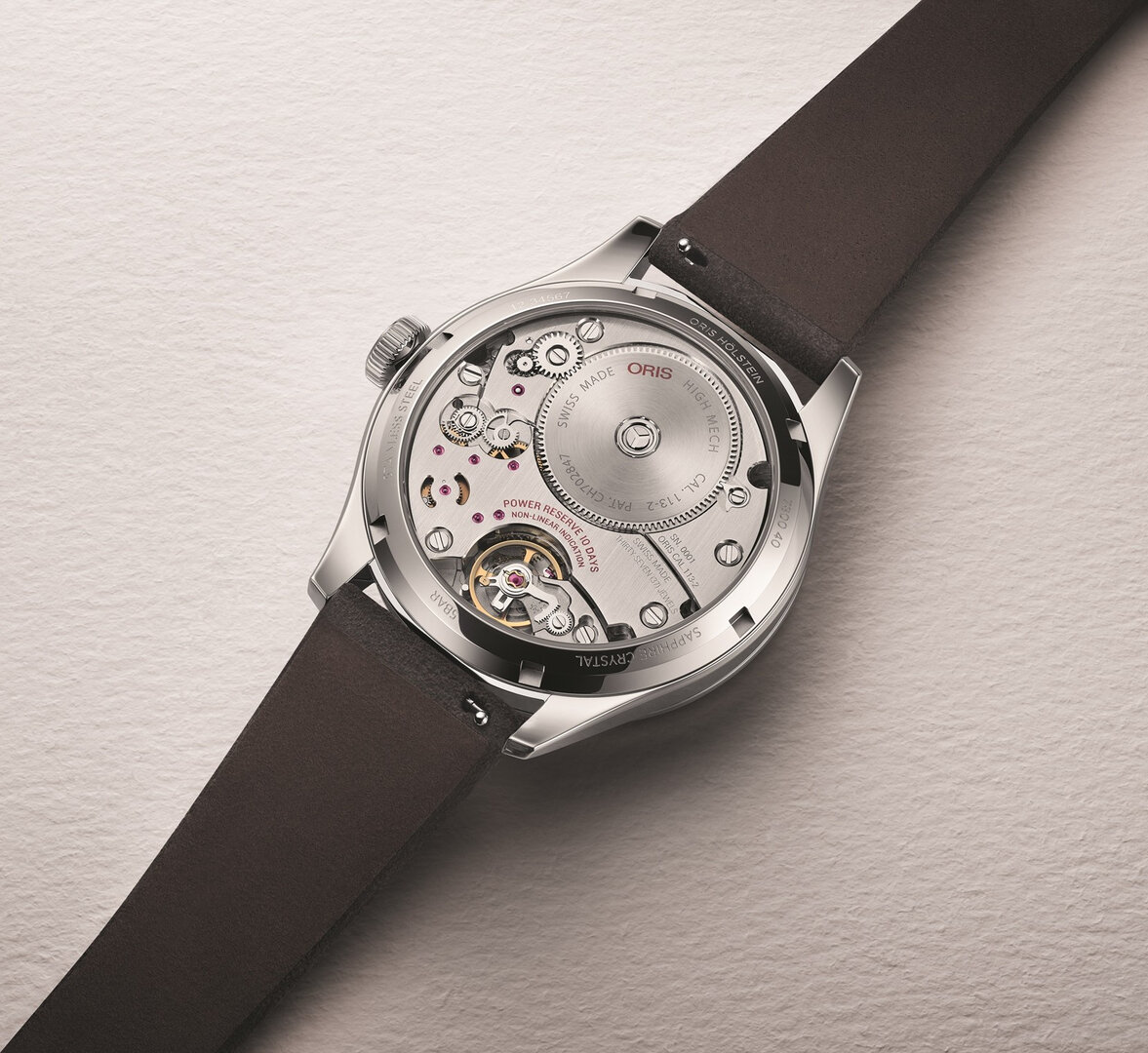Mechanický s ručným náťahom. Oris 113, Rezerva chodu 240h, 21.600 BPH (3Hz)