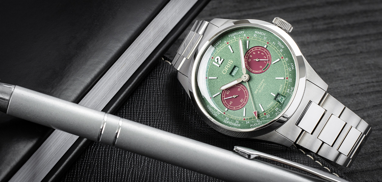 Mechanický s ručným náťahom. Oris 113, Rezerva chodu 240h, 21.600 BPH (3Hz)